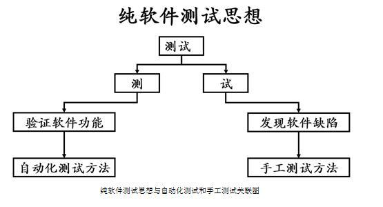 在目前如果不采用基于AI的自动化测试下,有机构做过统计,估计80%的缺陷是由人工测试发现的,自动化测试发现的缺陷仅占20%。在ISTQB初级大纲中,软件测试目的被概括为四点,其两点为“发现程序缺陷”和“对程序树立质量信心”。所以手工测试主要针对于新开发出来的特性,其目的主要在于“发现程序缺陷”;而自动化测试化测试主要在于对老特性的回归测试,其目的主要在于“对程序树立质量信心”。在作者提出的纯软件测试理念中,把软件测试分为“测”与“试”两部分:“测”即验证软件是否满足用户提出的需求,主要通过自动化测试来实现;而“试”即试图找出软件中存在的缺陷,主要通过手工测试来实现。所以自动化测试与手工测试缺一不可,互为补充。见下图