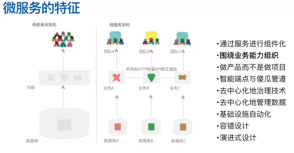 理解了这个法则,我们就可以很容易的明白,已经在单体架构下开发了多年的软件工程师,当被要求要使用微服务架构来进行设计和开发的时候,本能的反应方式肯定是:这不就是把原来的单体做小了吗?但是这样做出来的“微服务”真的能够给我们带来微服务架构的那些好处吗?真的能提高一个企业的数字化响应力吗?