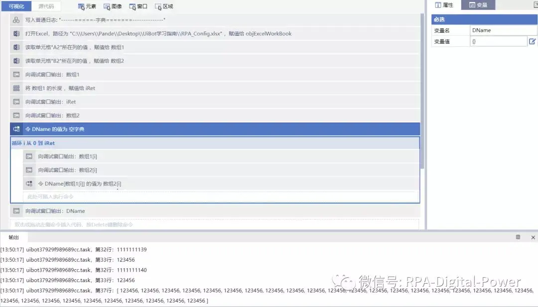 Log.Info("---打开Excel 把对应数据一次性放入数组里面 不要列名------") dim 数组1 dim 数组2 dim objExcelWorkBook objExcelWorkBook = Excel.OpenExcel("C:\Users\Pande\Desktop\UiBot学习指南\RPA_Config.xlsx",true) 数组1 = Excel.ReadColumn(objExcelWorkBook,"Sheet1","A2") 数组2 = Excel.ReadColumn(objExcelWorkBook,"Sheet1","B2")