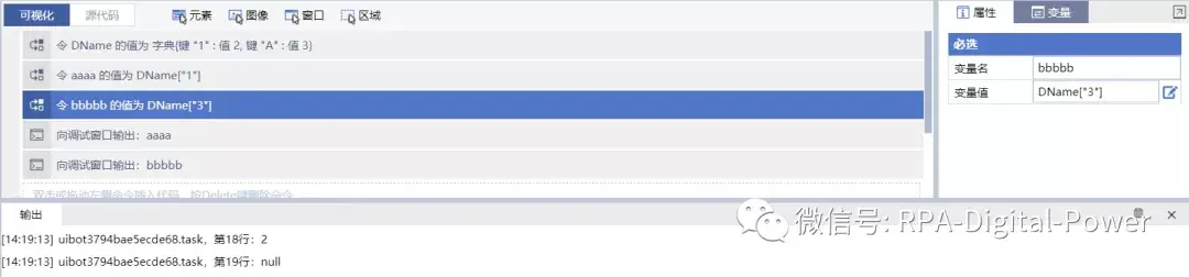 Log.Info("---通过key进行判断 根据返回结果是否为null 来进行元素是否存在----") dim DName DName={"1":2,"A":3} dim DicItem1 DicItem1=DName["1"] dim DicItem2 DicItem2=DName["3"]