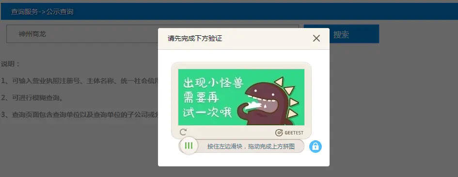 是比较常见的 “极验” 验证码,很多网站都在使用这个东西,但是政府的网站明显落后了一点,现在 "极验3.0" 已经更新了,这个还停留在2.0。区别就是2.0一开始显示的是完整的图片,点击滑动按钮会出现有缺口的图片,而3.0一开始显示的就是带缺口的图片,不过也是可以破解的。