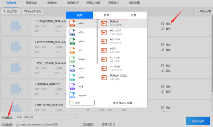 2、添加好vob文件后点击右侧的格式按钮或者左下角的输出格式按钮设置输出的视频格式和视频分辨率。由于要把vob格式转换成mp4格式,所以把输出的视频格式设置成mp4格式,而输出的视频分辨率可以设置为和原视频相同分辨率的同原文件格式。