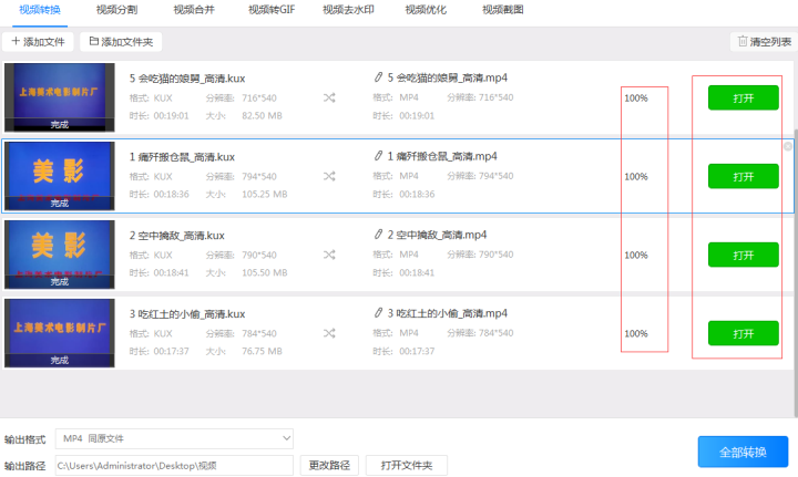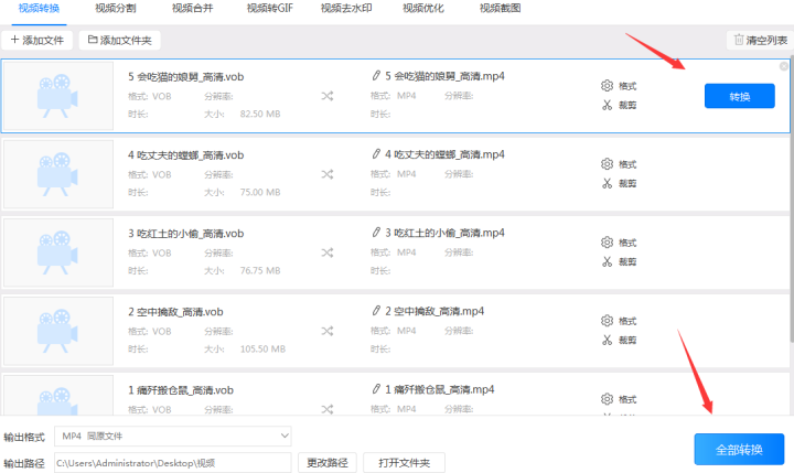 4、设置好输出路径后点击鼠标停留时出现的转换按钮逐个转换视频也可以点击右下角的全部转换按钮统一把vob格式转换成mp4。