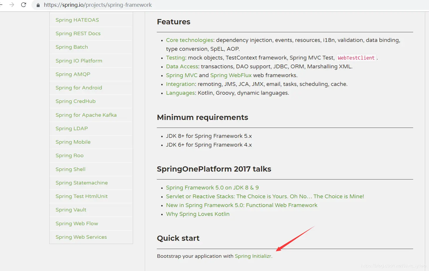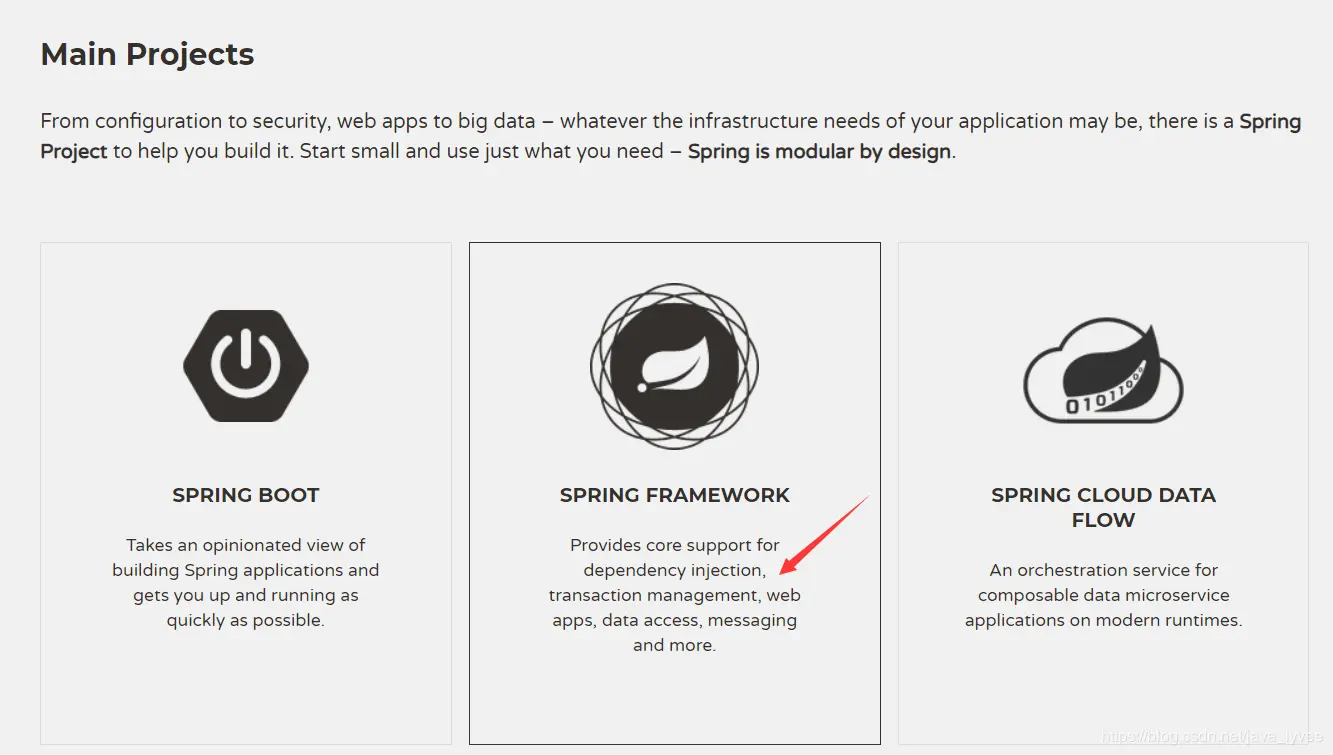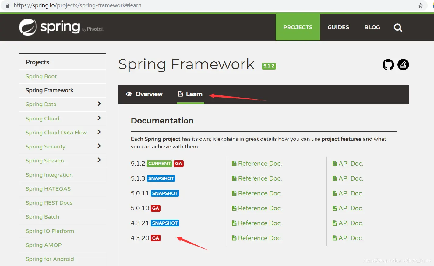 projects :spring公司所有的项目,好比apache公司也有很多项目,比如经典的tomcat、struts2、ibatis。点击project可以浏览到spring公司所有的项目,每个项目的文档都非常详细。