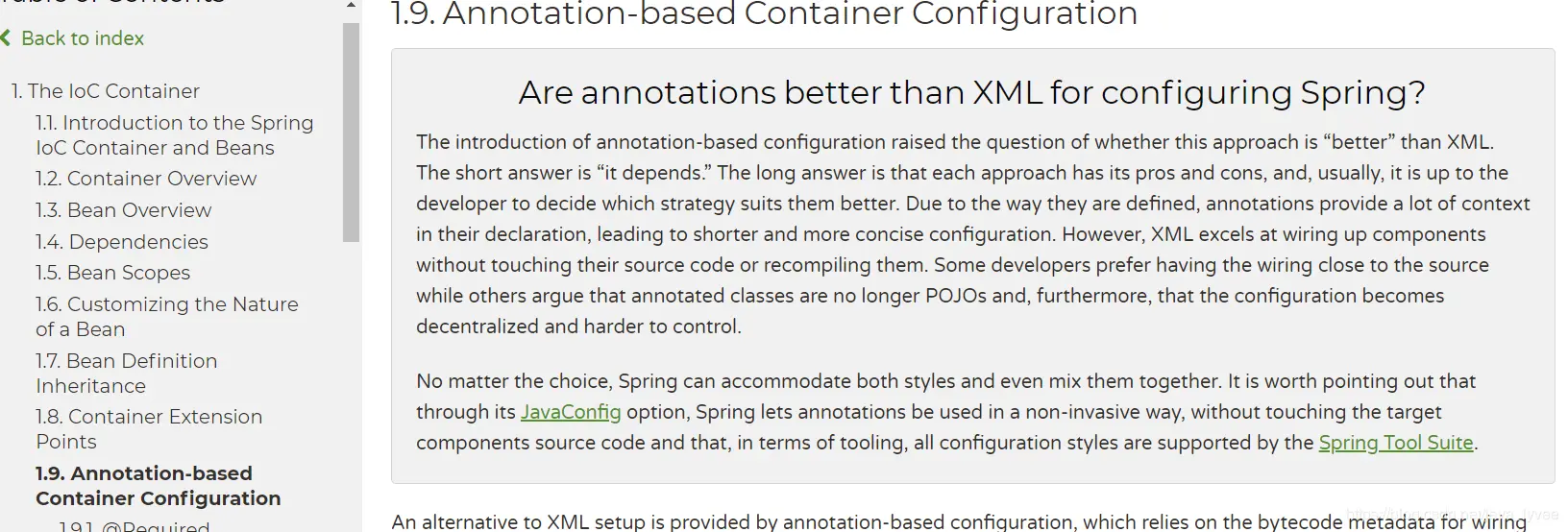 这三种风格到底孰优孰劣呢?这个问题就好比问java和php到底哪门语言好?又好比问苍某人的视频和吉尺某人的视频哪个好看一样。知道的人都知道这个和个人的观影心情以及个人审美有关系。但是博主经年累月的开发过程中对xml已经深恶痛绝,只要能不使用xml便不使用。故而后面的文章中大部分代码都是采用注解+javaconfig技术来实现。 再来看看spring官网对于这几种风格如何评价的呢?图6栗子: