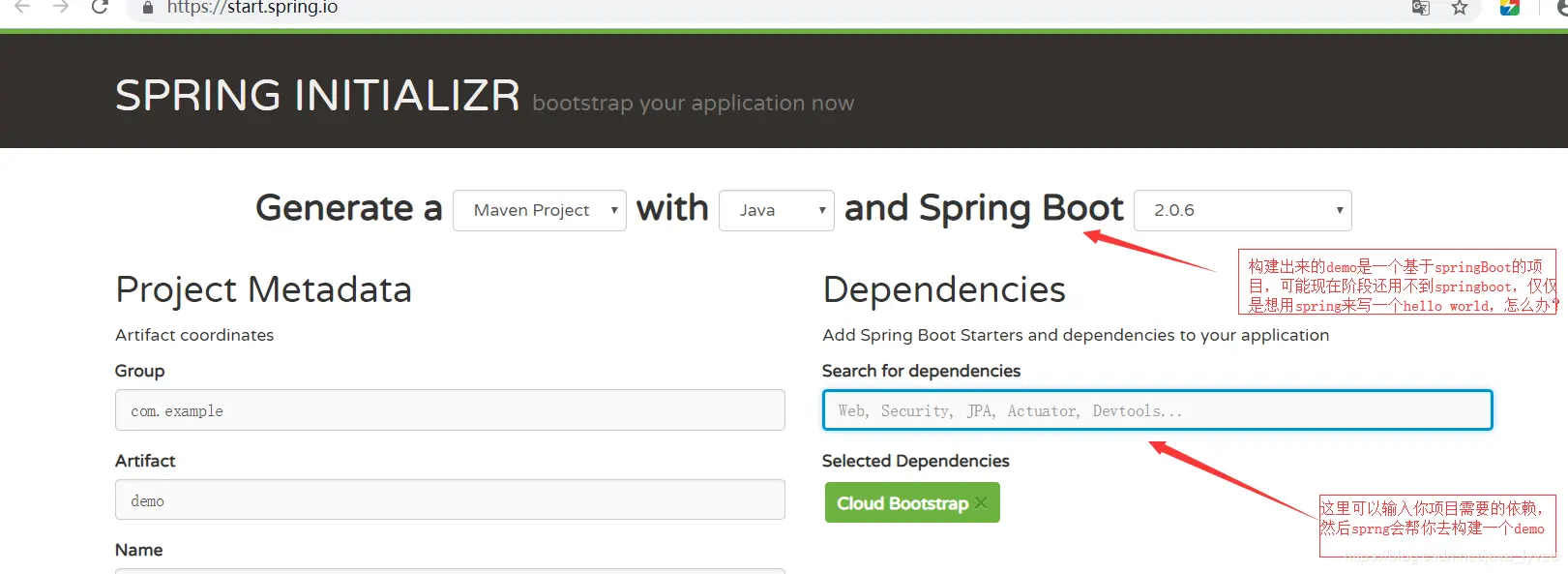 点进去之后你可以根据情况选择通过spring官网去帮你构建一个项目,但是他是基于springboot,这点很烦,作为一个新手可能我还不需要用springboot:,图8