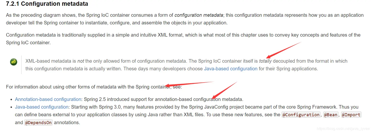 意思spring利用xml来配置元数据,但是不是唯一的一种形式,还运行我们使用java-based(上文所说的javaconfig技术)来配置应用程序。 还有更加直观的说明