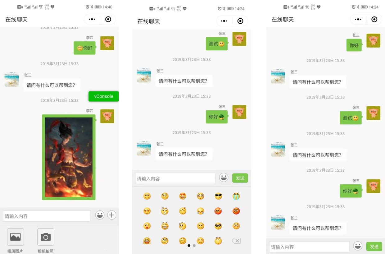 1、发送文字; 2、发送文字+表情; 3、发送图片(拍照+相册); 4、实现多图上传; 5、表情与文字搭配的解析; 6、下滑到底部; 7、分享功能(带参数); 8、预览图片;