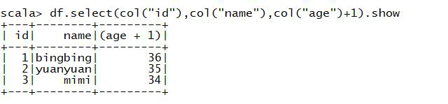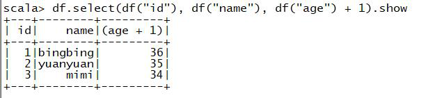 2.df.select(df("id"), df("name"), df("age") + 1).show