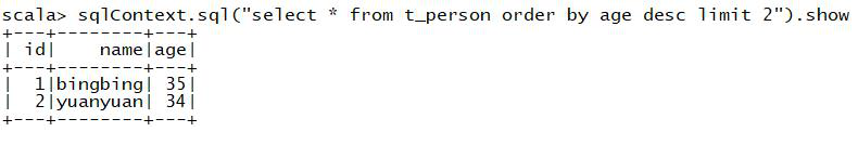 2.sqlContext.sql("select * from t_person order by age desc limit 2").show