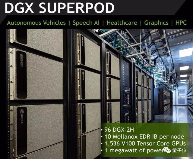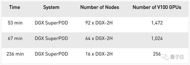 英伟达使用了92个DGX-2H节点、1,472个V100 GPU的DGX SuperPOD系统来训练BERT模型,将BERT-Large训练时间从几天缩短到到53分钟。