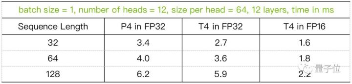 在小batch size情况下,12层Transformer在P4和T4上的性能表现如下: