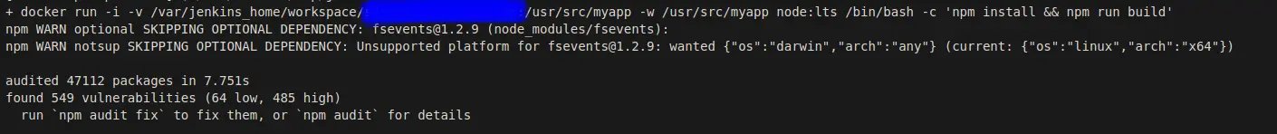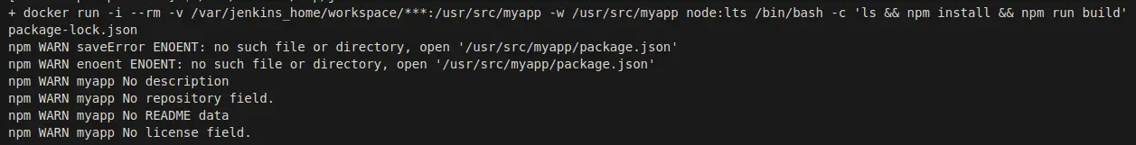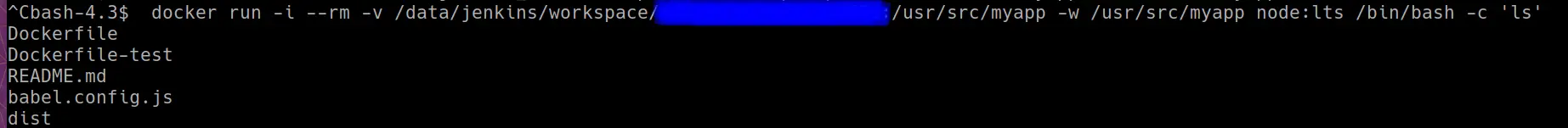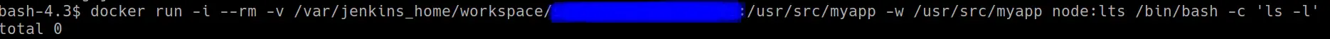 docker run -i -v "$PWD":/usr/src/myapp -w /usr/src/myapp node:lts /bin/bash -c 'ls && npm install && npm run build'