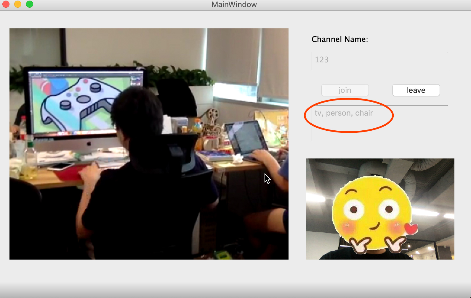 请注意,这个 Demo,我们仅作为演示,从获取到远端实时视频画面,到TensorFlow 进行识别处理,再到显示出识别效果,期间需要2至4 秒(视网络情况而定)。不同性能的机器、算法模型,其识别的效率也不同。感兴趣的开发者可以尝试自己更换算法模型,来优化识别的延时。