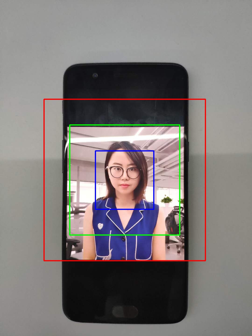 如上图,我们依次扣取不同人脸占比的图像送入同一个CNN网络,增加了更多活体判断的有效信息,其中蓝色框主要捕获摩尔纹、反光、人脸畸变等信息,红色区域捕捉手机边界、纸张边界等明显攻击信息,绿色区域是过渡区域,捕捉相关背景信息。