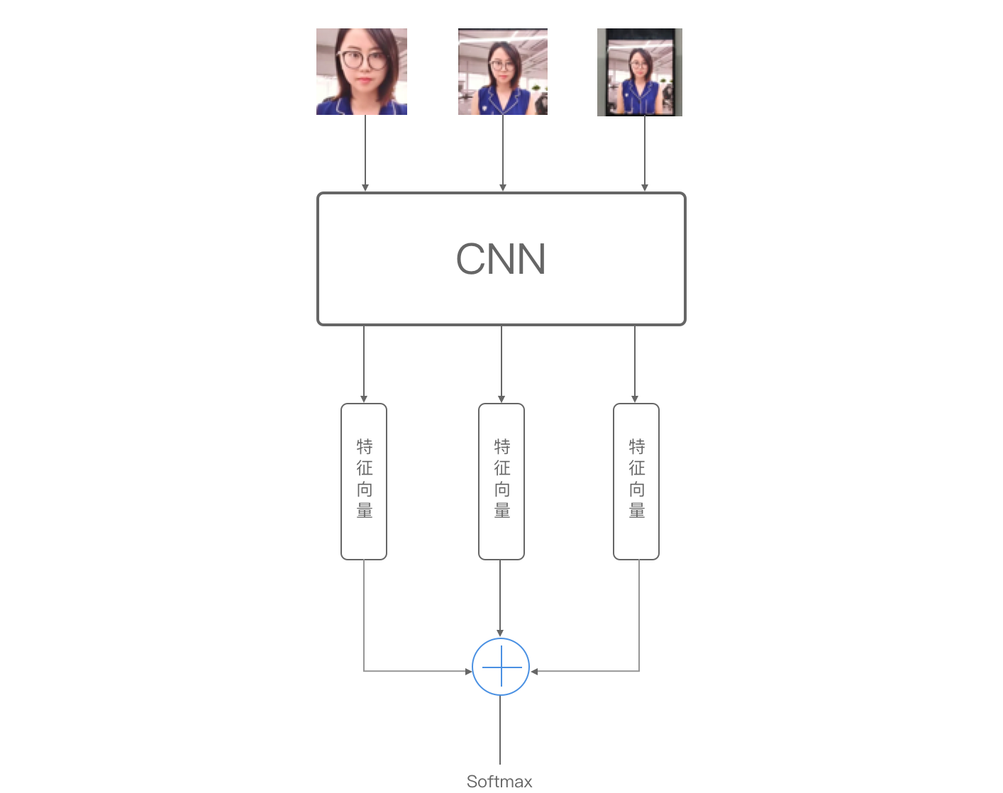 在自适应扣取人脸中,我们截取的三个不同区域的图像数据,共享CNN,这样也能减少模型的复杂度,再融合三个图像输出的不同特征,共同决定最后的分类结果。