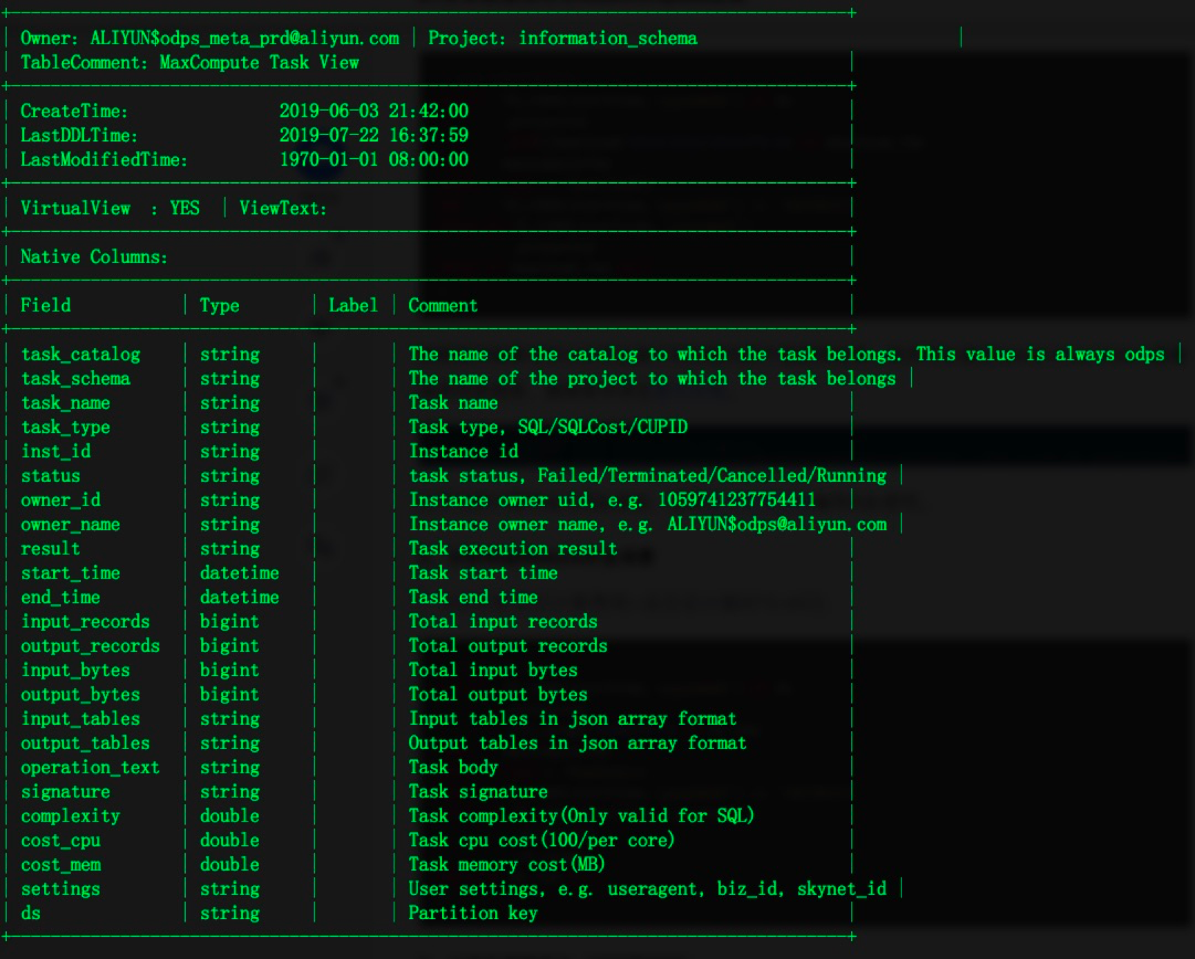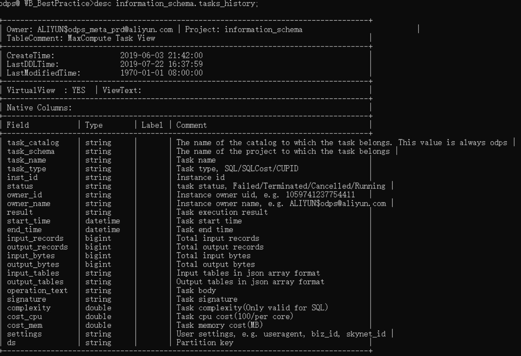 odps@ myproject1 > desc information_schema.tasks_history;如下如所示:
