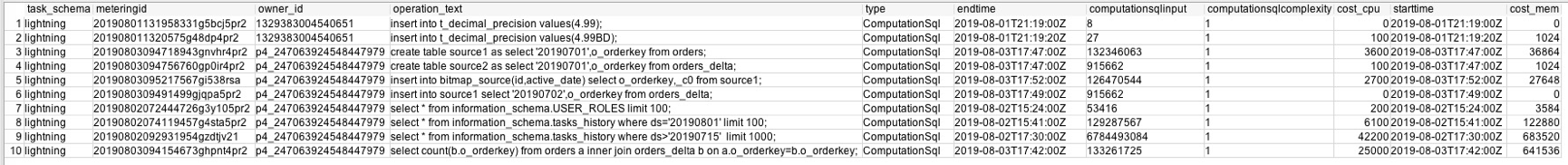 通过元数据服务Information_Schema里面的作业历史表tasks_history视图,可以查询到准实时的项目作业历史明细。包括:项目名称、任务名称、Instance id、开始时间、结束时间、任务复杂度、任务CPU使用情况等字段。