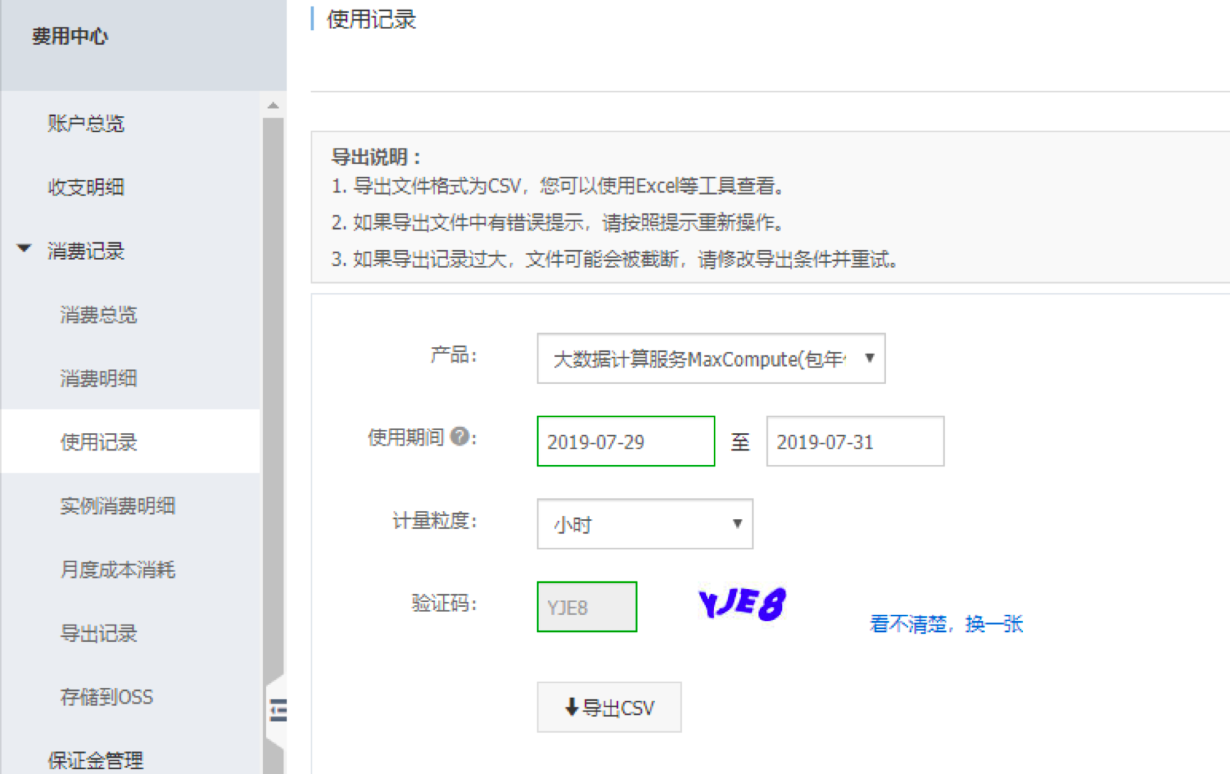 选择产品类型,填写使用期间,计算粒度,导出CSV格式