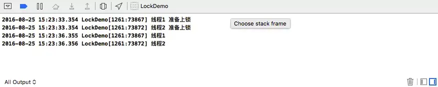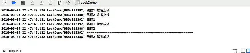 在 OSSpinLock1 图中可以发现:当我们锁住线程1时,在同时锁住线程2的情况下,线程2会一直等待(自旋锁不会让等待的进入睡眠状态),直到线程1的任务执行完且解锁完毕,线程2会立即执行;而在OSSpinLock2 图中,因为我们注释掉了线程1中的解锁代码,会绕过线程1,直到调用了线程2的解锁方法才会继续执行线程1中的任务,正常情况下,lock和unlock最好成对出现。