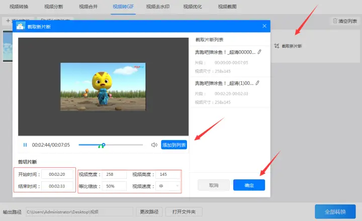 3、点击“截取新片段”按钮设置转换的视频参数。设置参数时首先可以调整开始时间和结束时间,其次可以设置视频的宽度和高度或等比缩放等参数。