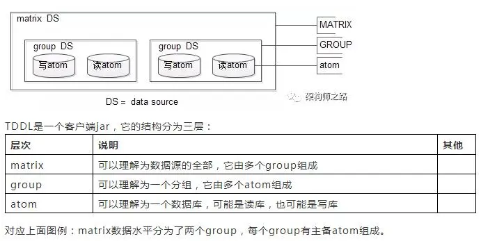 TDDL的体系架构:TDDL其实主要可以划分为3层架构,分别是Matrix层、Group层和Atom层。Matrix层用于实现分库分表逻辑,底层持有多个Group实例。而Group层和Atom共同组成了动态数据源,Group层实现了数据库的Master/Salve模式的写分离逻辑,底层持有多个Atom实例。最后Atom层(TAtomDataSource)实现数据库ip,port,password,connectionProperties 等信息的动态推送,以及持有原子的数据源分离的JBOSS数据源)。