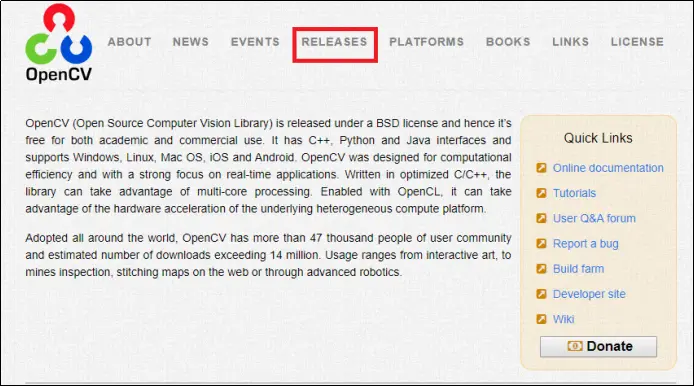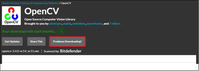 OpenCV将安装包托管在sourceforge,但是在中国大陆没有sourceforge的服务器或镜像,它默认会选择离我们最近的台湾一家机构的镜像.正常情况下等待5秒后会自动下载,当网络状况不好时可能会下载失败,可以点击下面红框选择其他机构的镜像下载.也可以尝试下面的替代链接