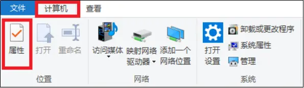 打开此电脑,选择”计算机”选项卡,找到”属性”并点击