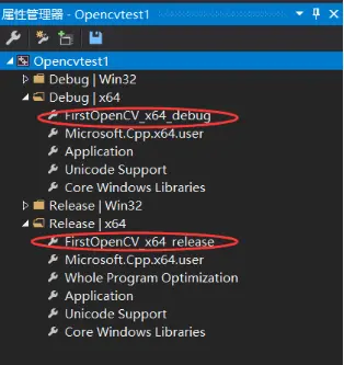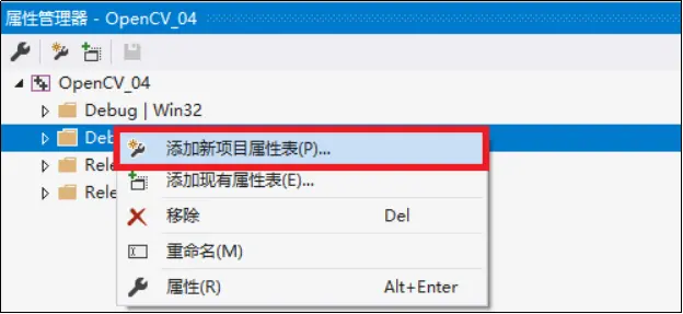 鼠标右键选择”添加新项目属性表”(首先选择”Debug|x64”)