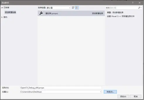 因为这个属性表创建以后可以供其他OpenCV项目使用,所以最好取个看得懂的名字和保存在找得到的位置,以后只需要”添加现有属性表”就可以导入这个属性表了