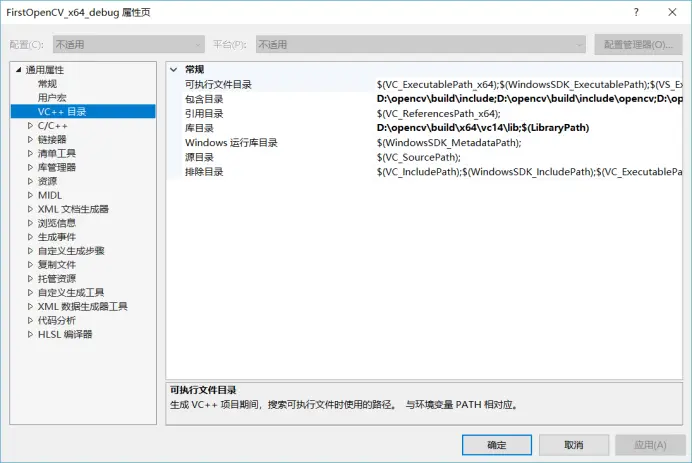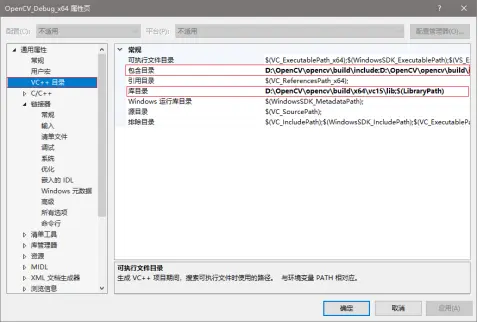 在VC++目录下配置两项配置项,分别是:”包含目录”和”库目录”. 包含目录填写下列信息(“~”用自己的安装目录替代): ~\opencv\build\include;~\opencv\build\include\opencv;~\opencv\build\include\opencv2 注意:不同路径用”;”隔开 库目录填写一下信息(“~”用自己的安装目录替代): ~\opencv\build\x64\vc15\lib (vc15-改->vc14)