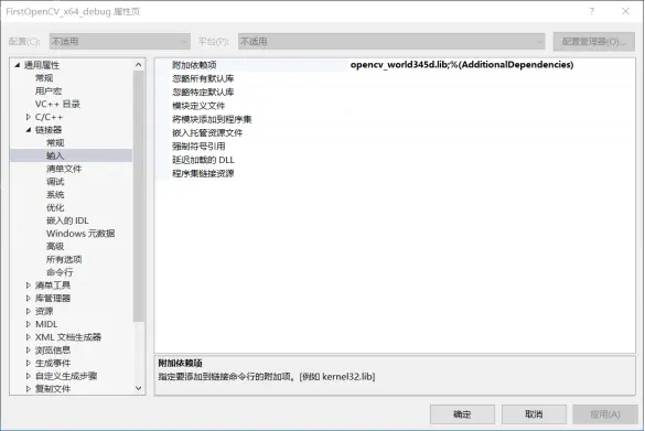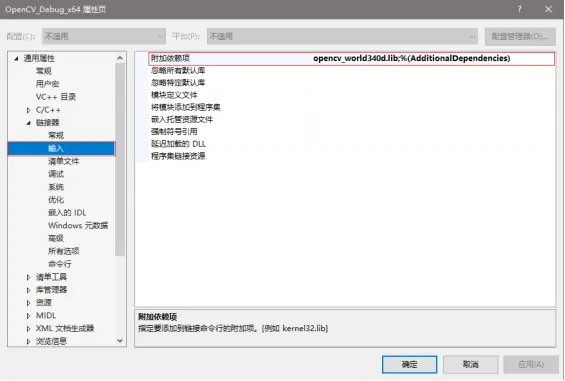 链接器只需要配置一项配置项:”附加依赖项”,填写一下内容: opencv_world340d.lib (340-改->345(文件中存在的实际情况)) 注意:在Debug的配置下一定是opencv_world340d.lib