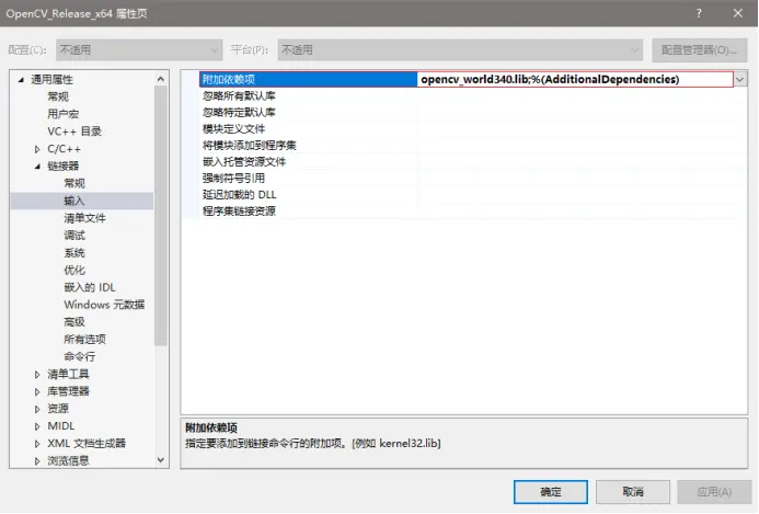 Release|x64配置与Debug|x64配置步骤是一样的,这里不再赘述,只有链接器的配置有一点不同:在附加依赖项填入 opencv_world340.lib --->345