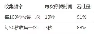 吞吐量就是 CPU 执行用户线程的的时间与 CPU 执行总时间的比值【吞吐量 = 运行用户代代码时间/(运行用户代码时间+垃圾收集时间)】,比如虚拟机一共运行了 100 分钟,其中垃圾收集花费了 1 分钟,那吞吐量就是 99% 。比如下面两个场景,垃圾收集器每 100 秒收集一次,每次停顿 10 秒,和垃圾收集器每 50 秒收集一次,每次停顿时间 7 秒,虽然后者每次停顿时间变短了,但是总体吞吐量变低了,CPU 总体利用率变低了。