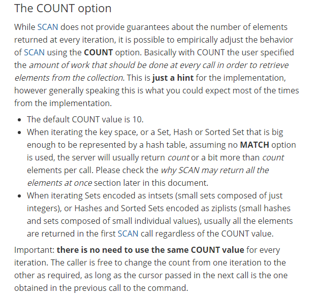 也就是在第一轮遍历的时候,KEY对应的所有Field-Value已经全量返回。笔者尝试增加哈希集合KEY = USER_ID:1里面的元素,但是数据量相对较大的时候,依然没有达到预期的分页效果;另一个方面,尝试修改命令中的COUNT值,发现无论如何修改COUNT值都不会对遍历的结果产生任何影响(也就是还是在第一轮迭代返回全部结果)。百思不得其解的情况下,只能仔细翻阅官方文档寻找解决方案。在SCAN命令的COUNT属性描述中找到了原因: