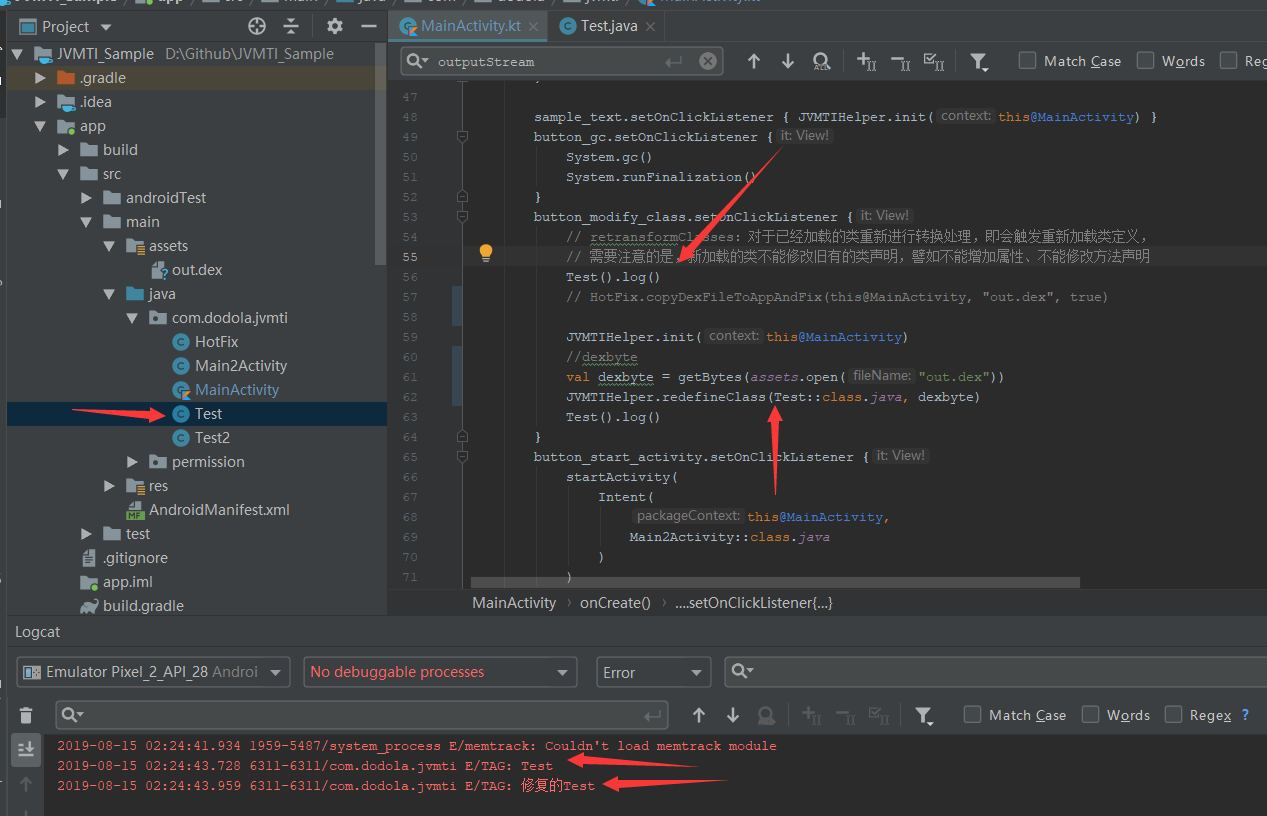 重点就是这句话JVMTIHelper.redefineClass(Test::class.java, dexbyte)调用了jni封装的jvmti的redefineClass方法