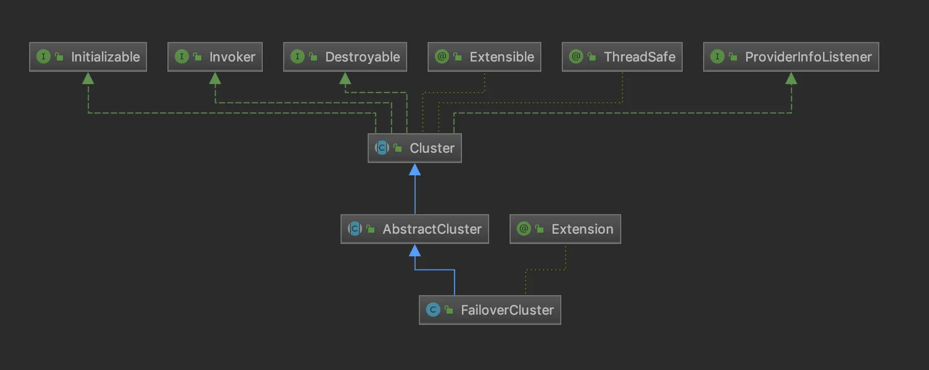 我们在调用FailOverCluster的时候实际上是调用的父类AbstractCluster的invoker方法,FailOverCluster关系图如下: