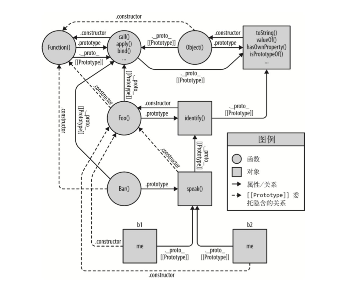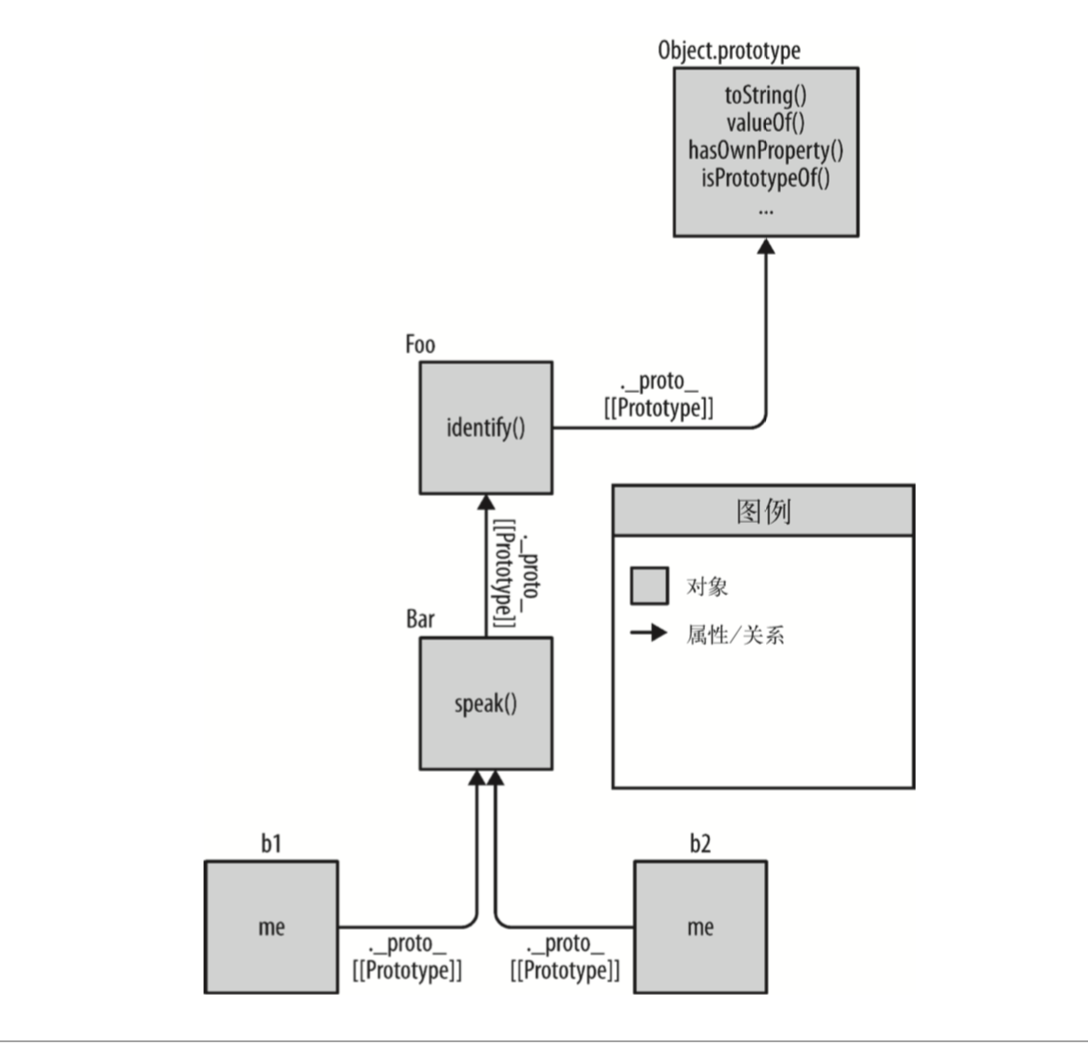 // 面向对象function Foo(who){this.me = who}Foo.prototype.identify = function(){return "I am" + this.me}function Bar(who){Foo.call(this,who)}Bar.prototype = Object.create(Foo.prototype)Bar.prototype.speak = function(){console.log("hello "+ this.identify()+'.')}var b1 = new Bar('b1')var b2 = new Bar('b2')b1.speak()b2.speak()// 对象关联var Foo = {init:function(who){this.me = who},identify:function(){return "I am" + this.me;}}var Bar = Object.create(Foo);Bar.speak = function(){console.log("Hello," + this.identify() + ".")}var b1 = Object.create(Bar);b1.init("b1")var b2 = Object.create(Bar)b2.init("b2")b1.speak()b2.speak()