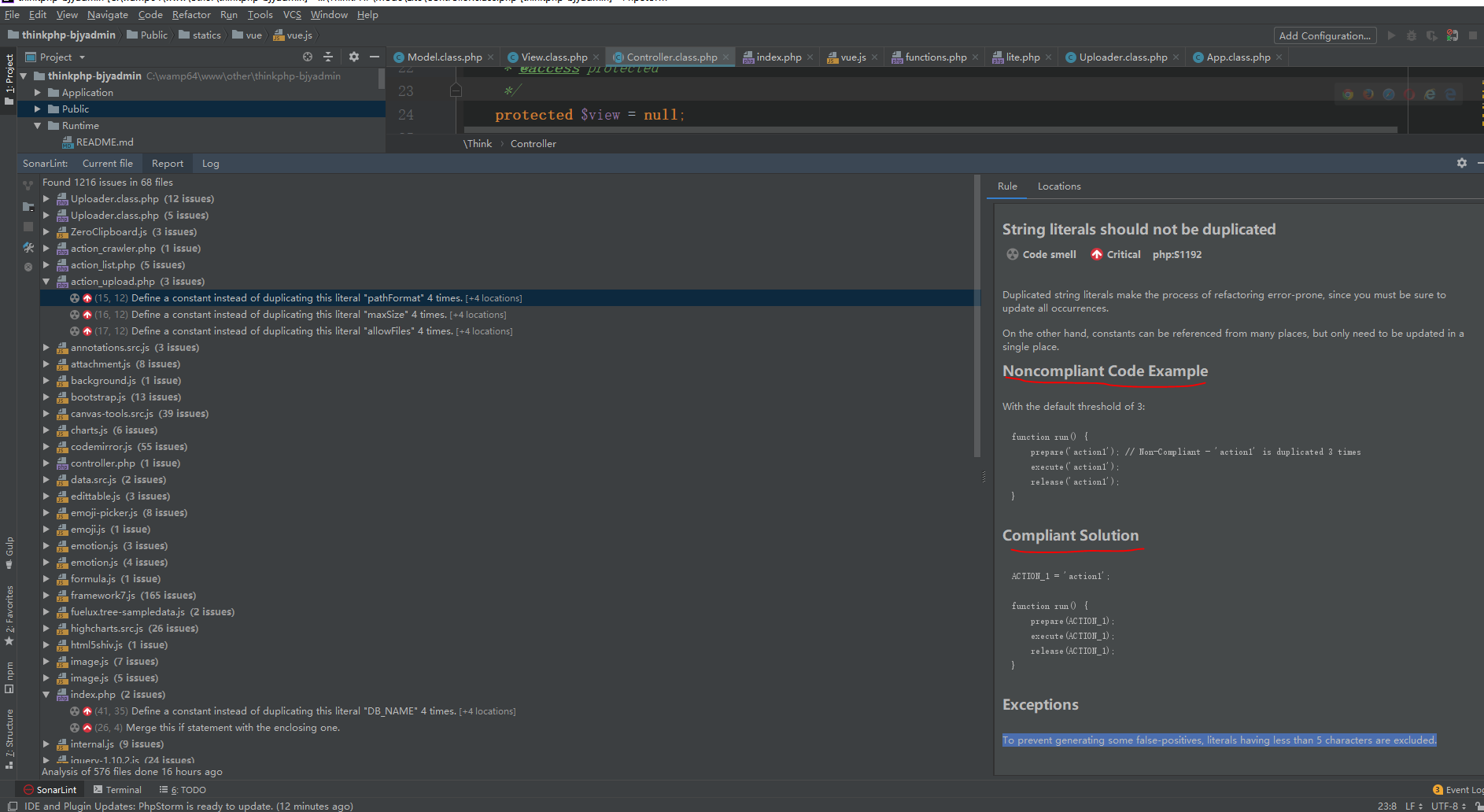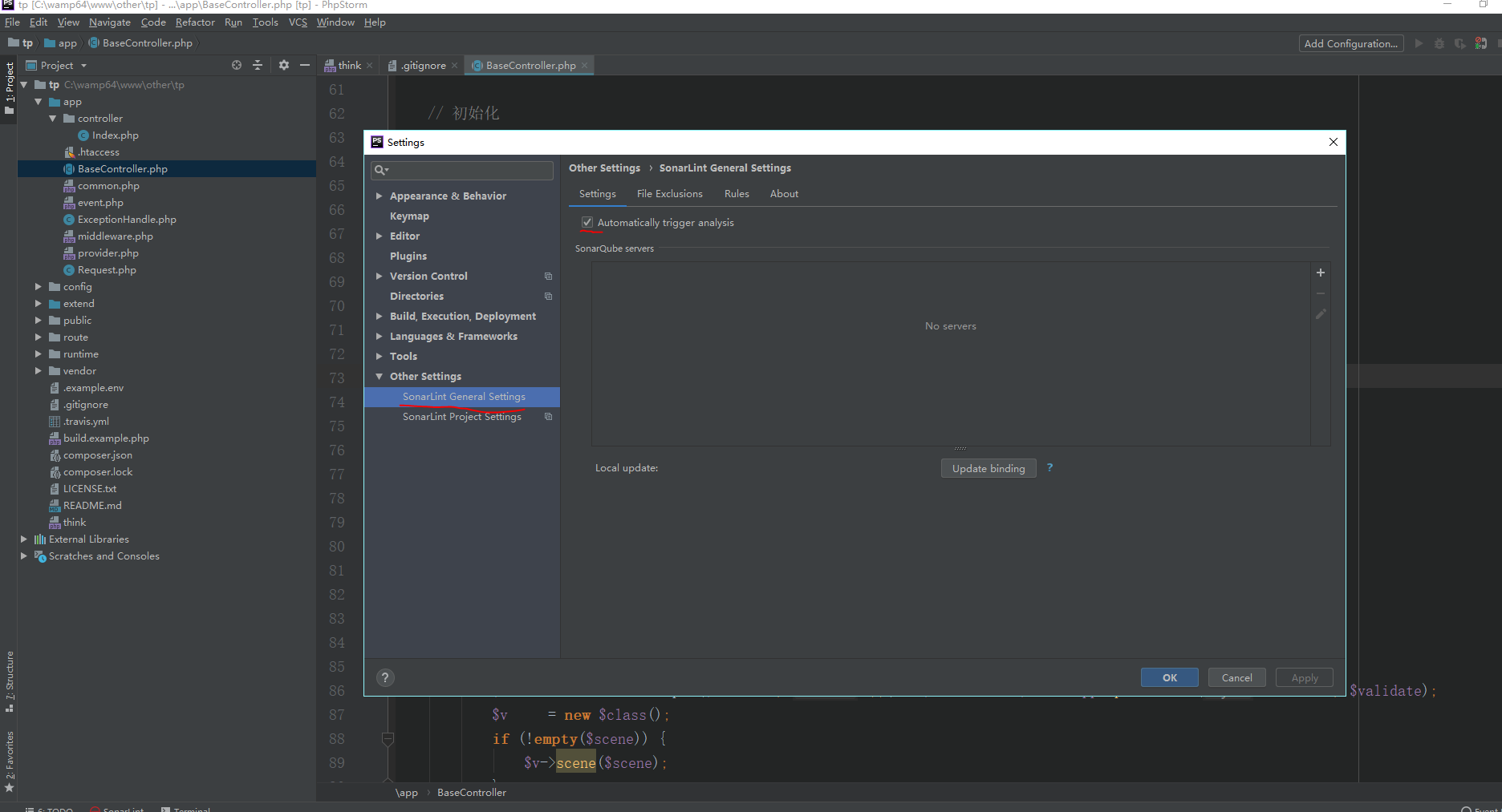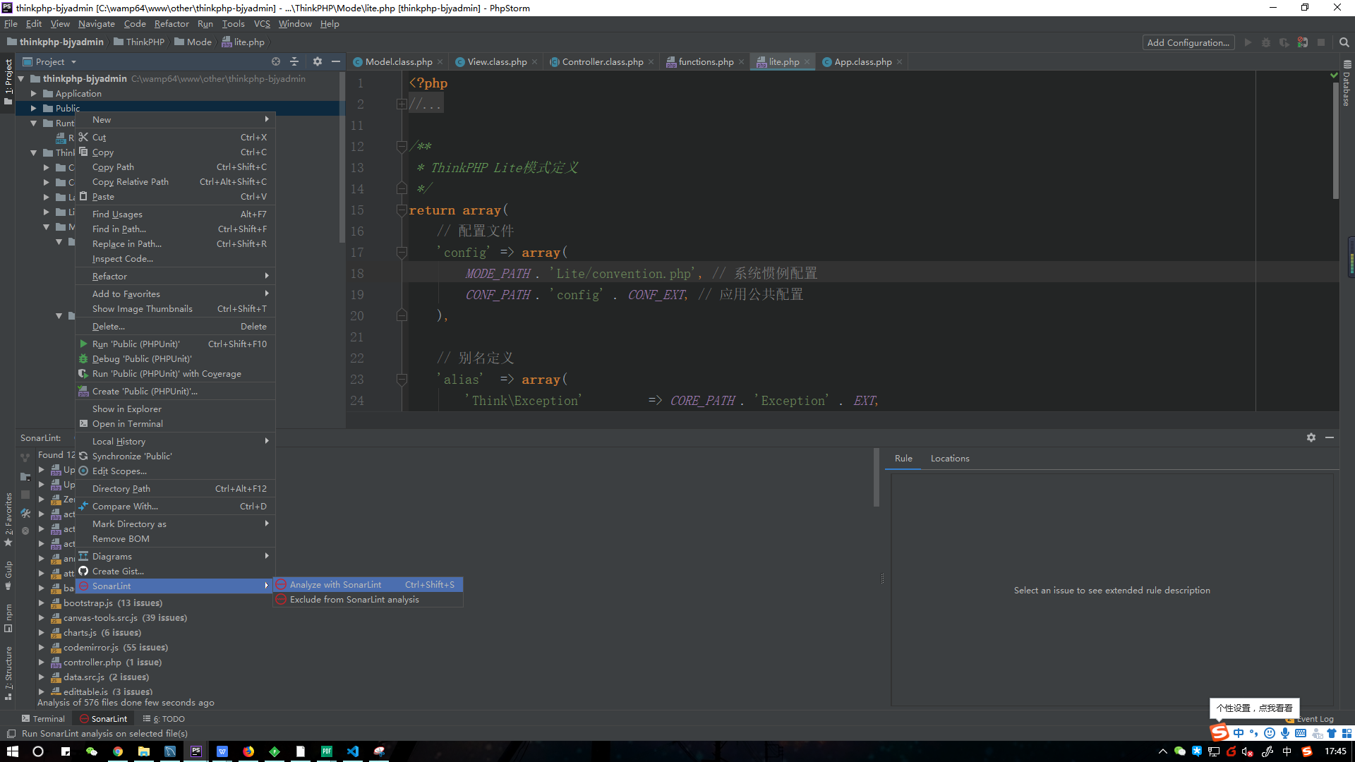 打开文件后,点击最底下工具栏里的SonarLint,即可展示报错,还可以点击绿色三角重新进行检测