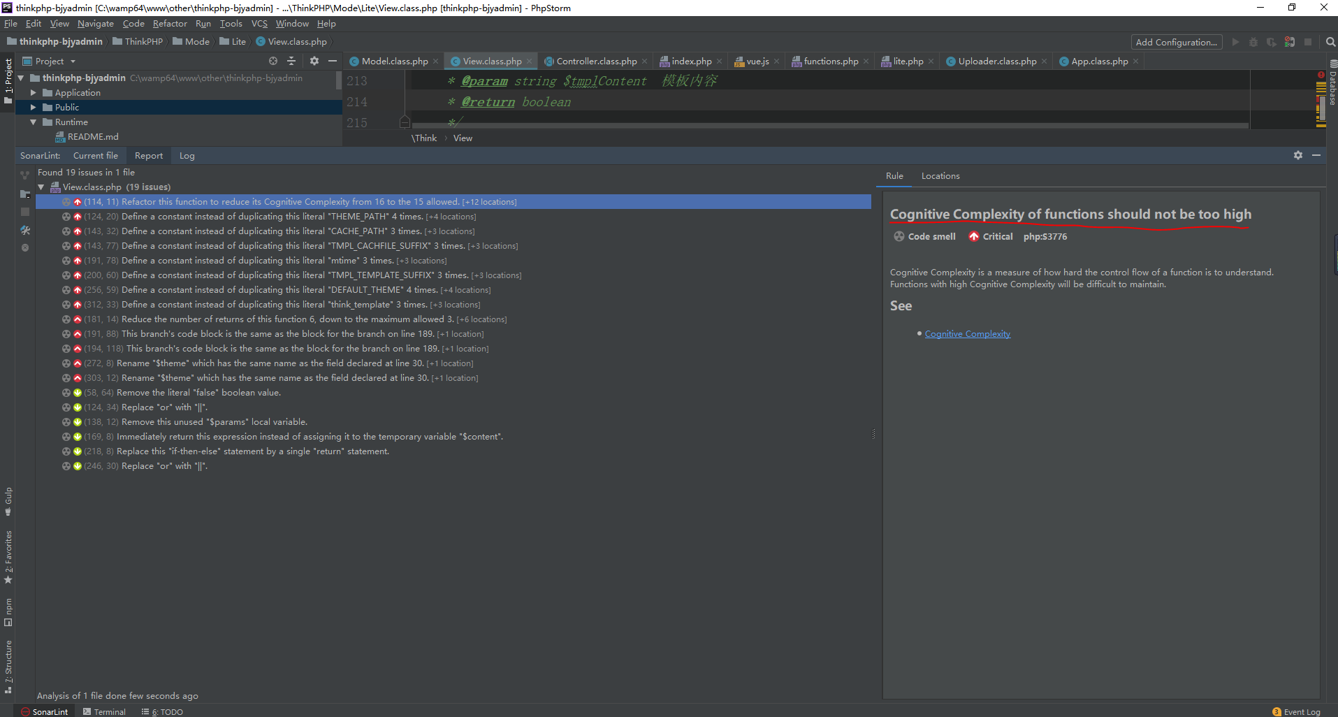 有个报错很重要,它还牵扯了一个很有意思的概念,就是Cognitive Complexity,直译过来叫认知复杂度。可以点击蓝色文字跳转到详细介绍,链接。概括起来就是一个函数的复杂程度,越高越难理解。