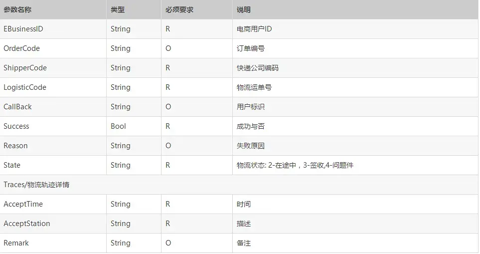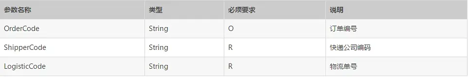 {"OrderCode": "","ShipperCode": "SF","LogisticCode": "118650888018" }// "SF"为顺丰快递公司编码,其他编码可在快递鸟官网下载5)JSON返回示例//没有物流轨迹的{"EBusinessID": "1109259","Traces":[],"OrderCode": "","ShipperCode": "SF","LogisticCode": "118461988807","Success": true,"Reason": null}//有物流轨迹的{"EBusinessID": "1109259","OrderCode":"","ShipperCode": "SF","LogisticCode": "118461988807","Success": true,"CallBack":"","State": 3,"Reason": null,"Traces":[