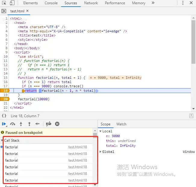 上面就是一个递归实现的阶乘,由于返回值中还有n,所以外层函数的执行环境理论上不能被销毁。但是 chrome 浏览器如此强大,factorial(10000)并没有爆栈。不过看到浏览器几千个调用栈也是吓了一跳: