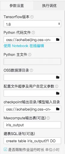 - MaxCompute输出表:写MaxCompute表要求输出表是已经存在的表,并且输出的表名需要跟代码中的输出表名一致。在本案例中需要填写“iris_output”