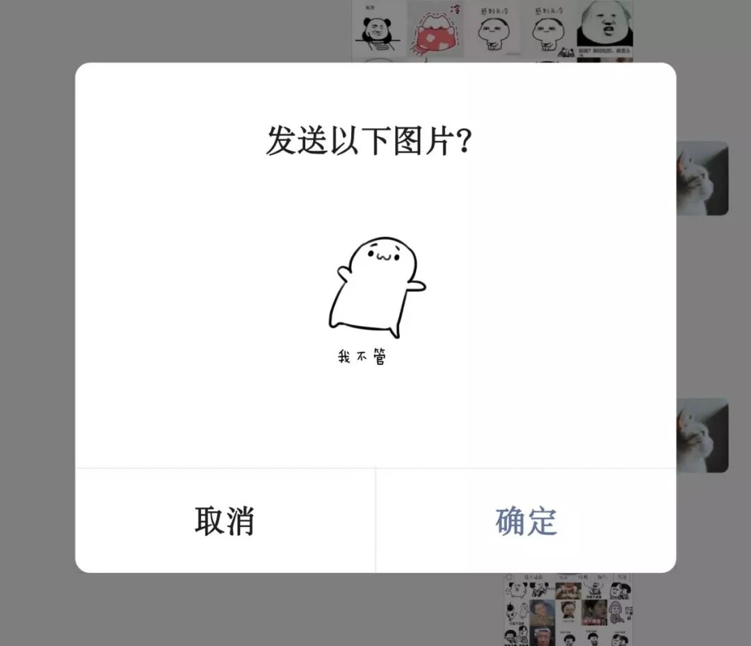 我们可以设置GridView的 OnItemClickListener或自定义监听来回调点击表情对应的图片路径,然后调用InputConnection.commitText(text)方法输入到微信,此时微信会自动解析并弹出一个确认对话框(图 3.1),点击发送即可发送图片,gif图则会自动解析成动态的微信表情发送。