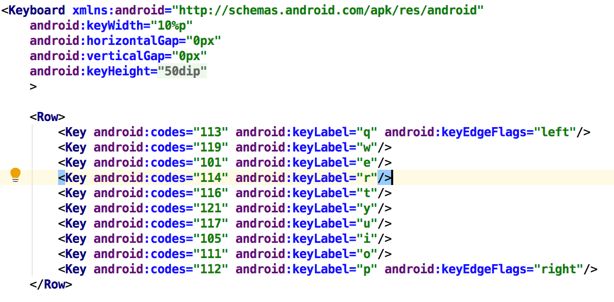 Keyboard的主要任务就是承载特定的键盘布局,如中英文键盘、数字键盘、符号键盘等,并且将布局中的按键和按键内容的KeyCode对应起来,通常这种对应关系可以用一个xml文件来定义(如图 2.1.3),在构造Keyboard的时候去加载这个xml文件,这样 KeyboardView就持有Keyboard所有按键的引用,在按下某个按键时,通过已设置的 OnKeyboardActionListener将按键对应的KeyCode传到InputMethodService(要记得,此时