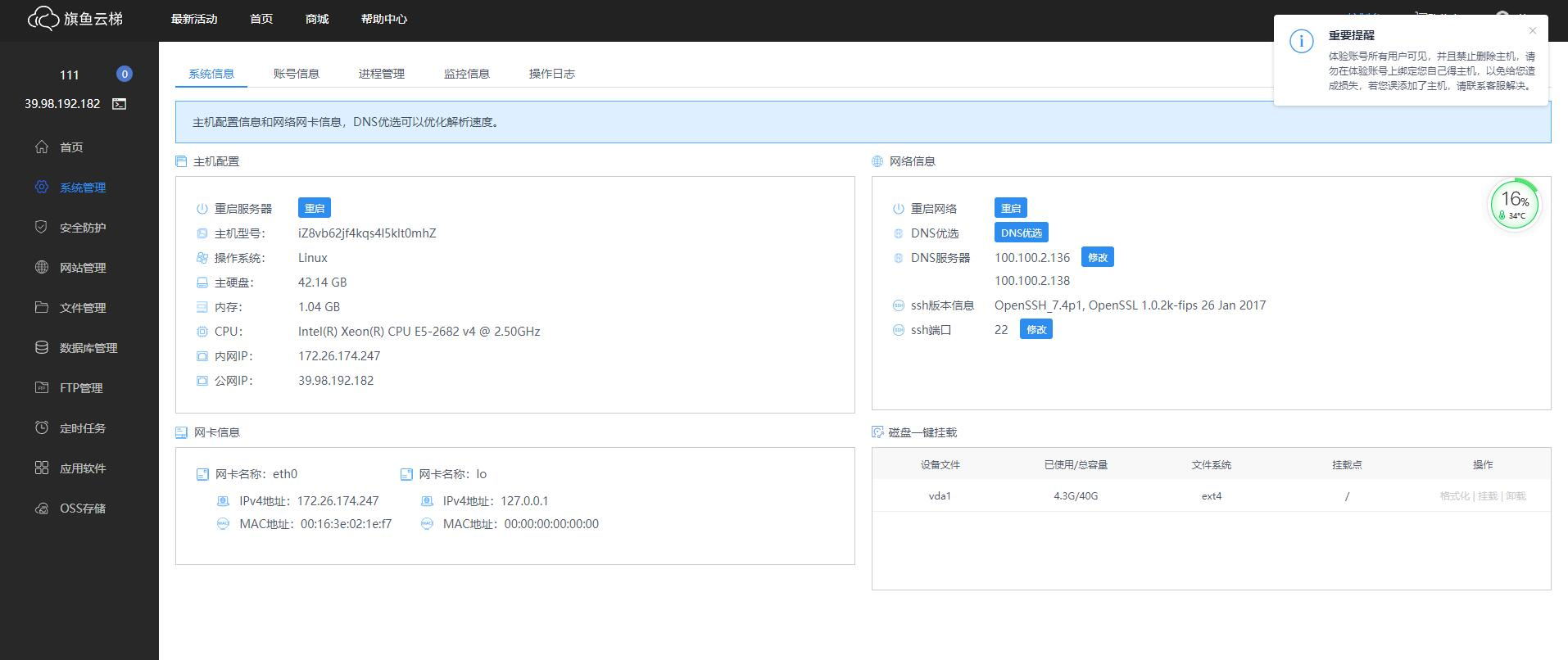 旗鱼云梯的磁盘一键挂载功能介绍: 一、发现磁盘,会显示磁盘,只需一键加载就可以使用。 二、切记在加载磁盘后在进行建站需求。 三、默认将数据盘挂载到www目录下 四、若您的服务器之前安装过Windows系统,只需要格式化后,一键挂载就可以了。无需手动用第三方工具删除格式化才能用。 五、工具完全自动化,还支持多块磁盘操作,让你在界面化下操作这一系列。