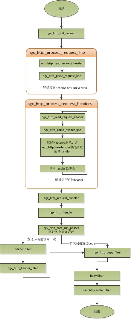 Nginx本身做的工作实际很少,当它接到一个HTTP请求时,它仅仅是通过查找配置文件将此次请求映射到一个location block,而此location中所配置的各个指令则会启动不同的模块去完成工作,因此模块可以看做Nginx真正的劳动工作者。通常一个location中的指令会涉及一个handler模块和多个filter模块(当然,多个location可以复用同一个模块)。handler模块负责处理请求,完成响应内容的生成,而filter模块对响应内容进行处理。