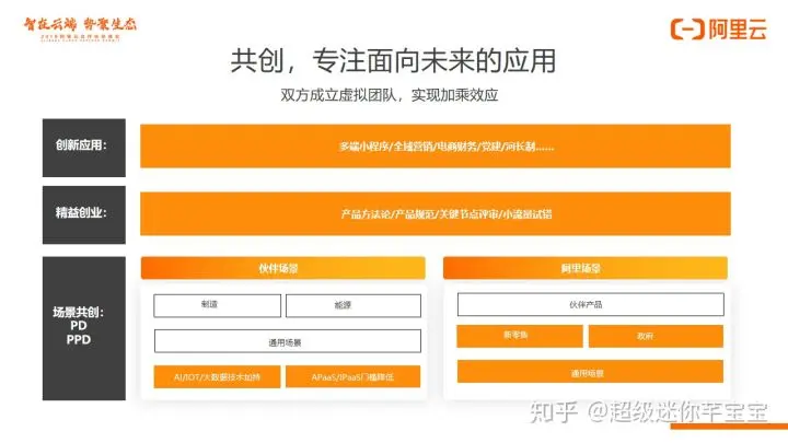 在共创过程中,我们会和生态伙伴一起来做产品,把阿里巴巴的产品设计规范赋能伙伴。通过MVP快速迭代,双方进行关键把控点的评审,最后给客户提供具备独特竞争力的小程序,党建,营销等产品。