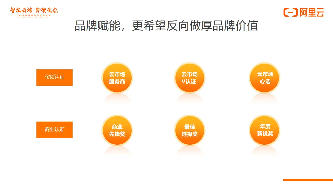 通过我们的品牌为合作伙伴赋能,增加流量和品牌影响力;同时,伙伴通过优质的运营和服务,获得更多的客户口碑反哺平台品牌。我们为用户开放几个品牌:第一个是云市场认证的服务商,第二个是云市场的心选服务商。通过云市场认证和心选认证,帮助伙伴成功。