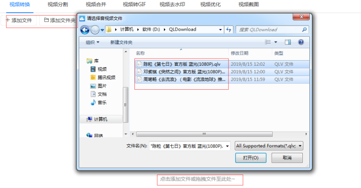 1、首先把在腾讯视频下载好的视频都添加到软件中。添加的时候可以点击软件左上角的“添加文件”/“添加文件夹”按钮,或者用拖拽的方式直接把视频拖拽到软件。